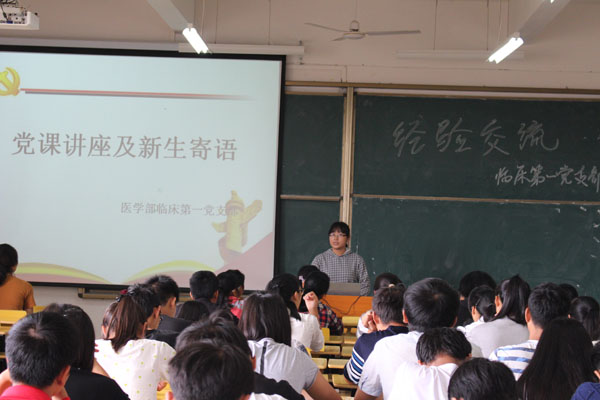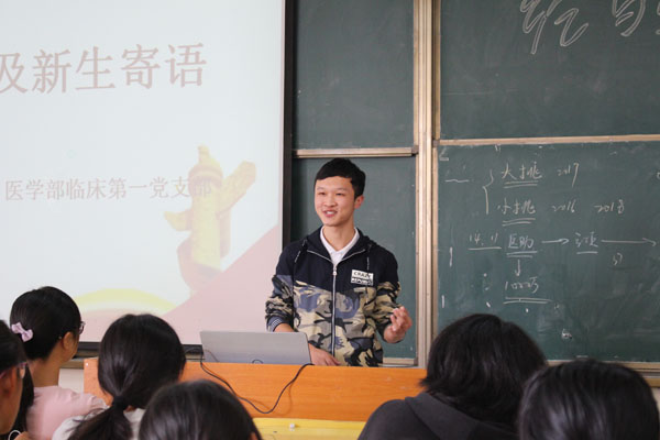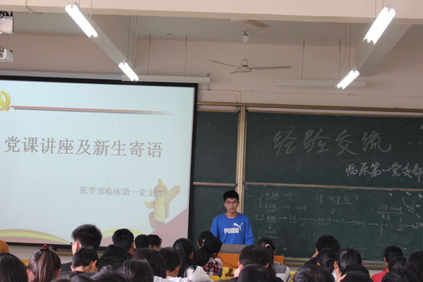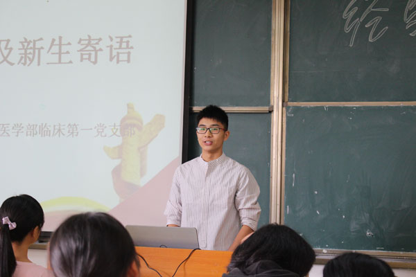 10月26日,医学部学生第一党支部在13栋开展新生寄语活动。党支部书记郭敏娜老师出席活动,13临床本1班吴汶霖、13临床本1班胡奕卿、13临床本3班丁思霄、14临床本2班雷康卿、14临床本3班刘济五位优秀学长学姐就学习、科研比赛、班级及团学工作等方面,与16级临床专业全体新生进行了经验分享。本次交流会由医学部前组织部部长黄佳文主持,首先由刘济同学给同学们分享参加学生会的收获:独立培养、提升自我、锻炼意志,进入学生会是拓展人际交流、积累工作经验、提高组织能力的一个途径;接着丁思霄同学分享参加挑战杯的体验与收获,详细介绍了挑战杯的种类、比赛过程、参与办法;作为即将奔赴同济大学联合培养的雷康卿同学则专门给大家分享了踏上同济之路的奋斗历程,分享了自己的学习经验;然后胡奕卿同学分享了作为团支书的工作职责和工作经验:明确责任和创新方法;最后吴汶霖无私分享自己总结的学习经验,利用遗忘曲线找准学习方法,并提出应利用知识框架和思维体系去记忆学习。