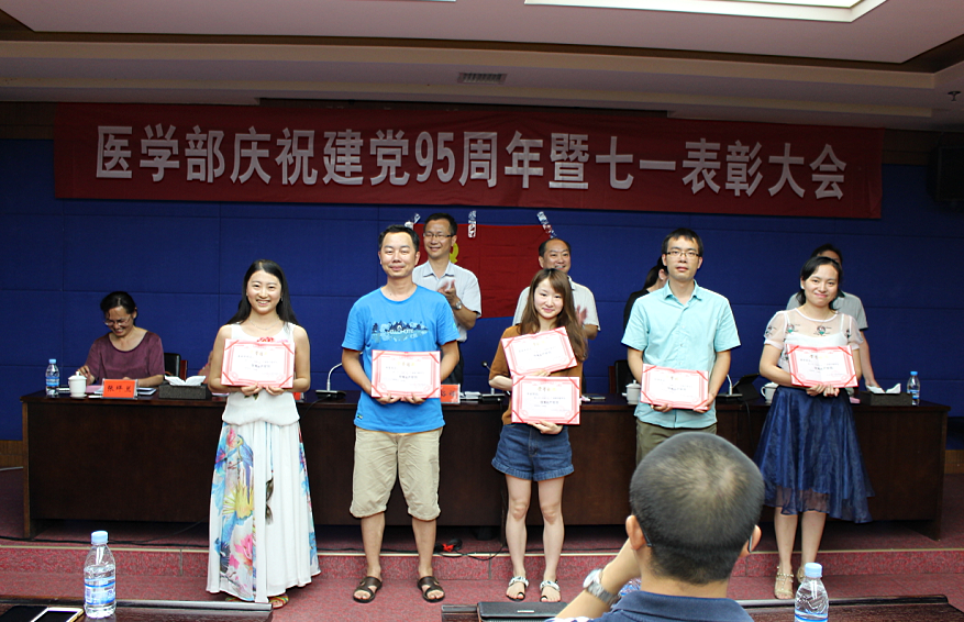 医学部党委委员、副主任朱水华同志宣读了《关于表彰2015-2016学年度先进党支部、优秀党务工作者、优秀共产党员的决定》。李裕福、肖游章、朱水华、习宁英、张坪兰、胡煜辉等同志分别为受表彰的先进集体和先进个人颁了奖。医学部党政办公室负责人杨学辉同志带领新党员面对党旗庄严宣誓,全体老党员重温了入党誓词。