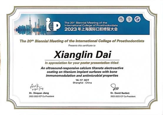 廖岚教授团队代香林博士的研究报告“An ultrasound-responsive calcium titanate electroactive coating on titanium implant surfaces with bone immunomodulation and antimicrobial properties”入选ICP国际口腔修复大会优秀壁报展。团队研究发现钛植入物表面的超声响应性钛酸钙电活性涂层,具有骨免疫调节和抗菌特性,此次壁报展示了其中一部分研究成果。