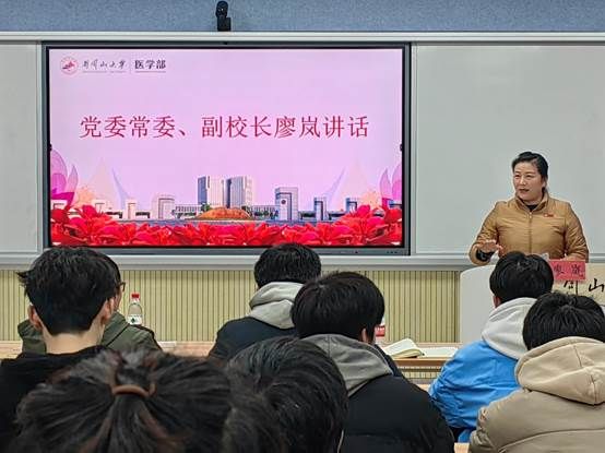活动中,廖岚全程参与了集中学习和主题研讨环节。廖岚表示,党有所指,团有所向,用党建带团建是本次主题教育的重要内容,我们要牢牢把握新时代中国青年运动的主题,为党培养社会主义合格建设者和可靠接班人,弘扬红医精神,培养高质量的医学人才。她指出,团员和青年主题教育“挺膺担当”这一专题,表达的是一份责任,传递的是一份担当,这要求大家不仅要有能力、有学识,更要敢担当、去奉献,这样才能建功立业,实现人生价值。她还结合了自身的成长经历,希望大家能够珍惜来之不易的学习机会,鼓励大家往更高的平台发展,去更广阔的天地间施展抱负,与时代同频共振。随后,她还向大家提出了三点希望:一是要至诚报国,忠诚于党和人民的卫生事业,自觉用习近平新时代中国特色社会主义思想武装头脑;二是要勤学笃行,刻苦钻研,厚积扎实的知识功底,提高自己的岗位胜任力;三是要甘于奉献,踊跃投身健康中国事业,敢于担苦、担难、担重、担险,争当排头兵和生力军。