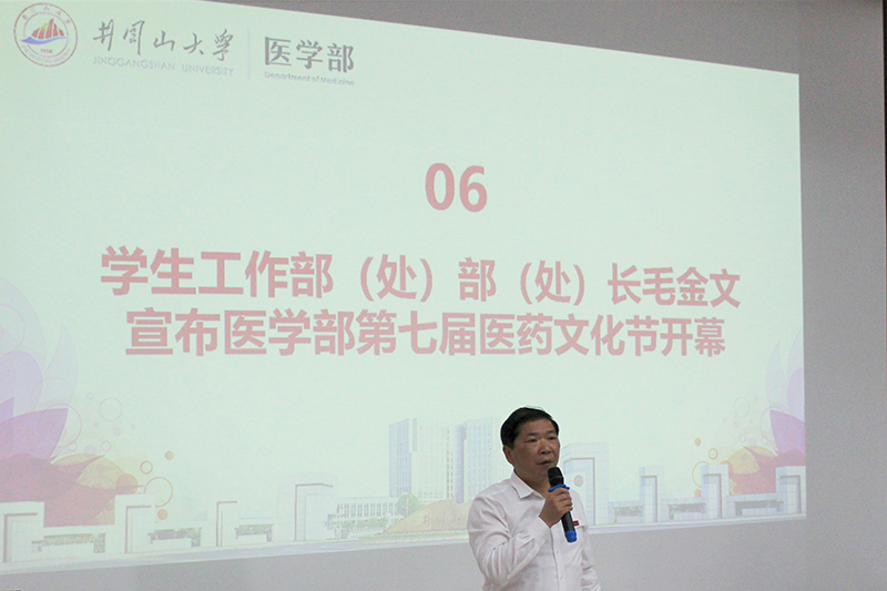 刘坤在会上作了动员讲话。他表示,医药文化节是我们弘扬红医精神,彰显医药文化特色,推进文化育人的重要载体,更是医学生们展现青春活力和精神风采的良好平台。为此,他对活动提出三点希望,一是坚持正确导向、树立自信。我们要弘扬社会主义核心价值观,将中医药文化和红色文化、传统文化、健康文化相结合;二是坚持传承精华、守正创新。我们要遵循中医药自身发展规律,突出原创性、保持民族性、体现时代性,推广科学、正确的中医药文化观;三是坚持以人为本、产教融合。我们要以学校生物医药“专精特新”产业学院建设为契机,积极推动吉安生物医药大健康主导产业的转型升级和高质量发展,把自己的专业和服务社会结合起来,让中医药文化发展成果惠及社会。