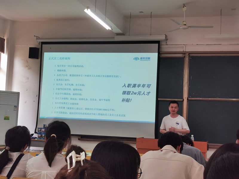 宣讲会之初,迪安诊断负责校招工作的陈中浩老师从新冠疫情防控引出了招聘宣讲的主题,带领同学们观看了迪安诊断集团的企业宣传片,了解了迪安的基本概况、企业文化、运营模式、平台建设和人才战略等。接着,迪安诊断吉安区域经理黄宇分享了自己的职业经历和对迪安事业的理解,和同学探讨职业生涯规划,鼓励有识之才加入迪安,承担起“让国人平等地分享健康”的使命和责任,给同学们很多启发。