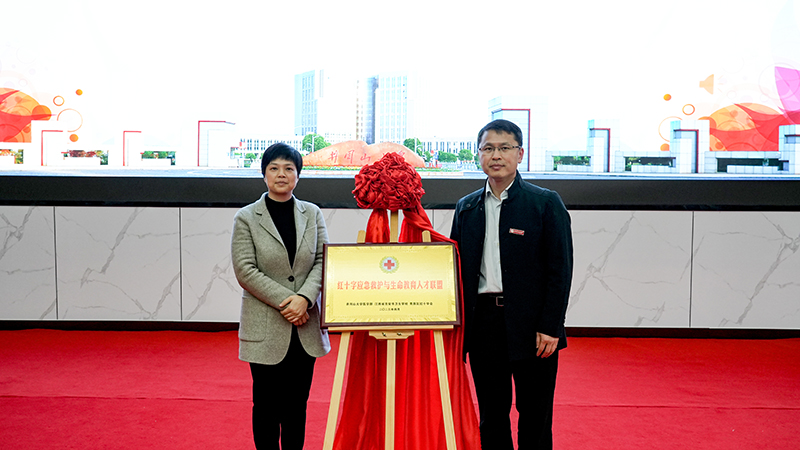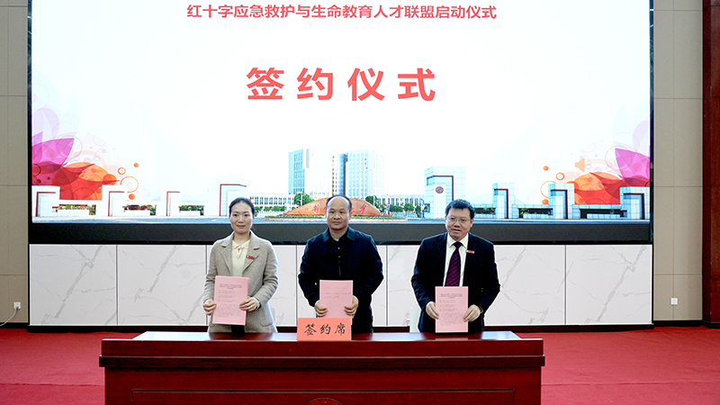 最是一年春好处,校会合作喜联盟。4月6日下午,井冈山大学医学部、吉安市卫生学校、青原区红十字会“红十字应急救护与生命教育人才联盟”启动仪式在学校举行。校党委常委、副校长冷明和青原区委常委、组织部长彭敏共同为医学部、吉安卫校、青原区红十字会“红十字应急救护与生命教育人才联盟”揭牌。冷明和青原区政府副区长、区红十字会会长张早来共同为“井冈山大学红医班生命教育活动基地”和“吉安卫校红医先锋生命教育实践基地”授牌,医学部党委书记康永平、吉安市卫生学校党委书记王静、青原区红十字会党组书记、常务副会长刘圣南代表三方共同签订“红十字应急救护与生命教育人才联盟”战略合作框架协议。校长助理张赫致欢迎词。