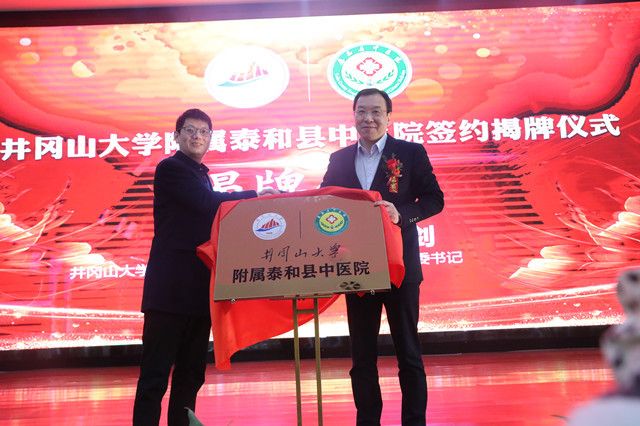 党委副书记、校长罗旭彪和泰和县委书记孙英剑为井冈山大学附属泰和县中医院揭牌
