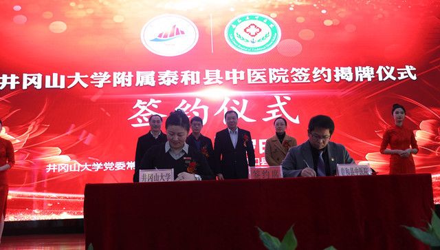 2月17日下午,井冈山大学附属泰和县中医院揭牌签约仪式在泰和县中医院举行。党委副书记、校长罗旭彪和泰和县委书记孙英剑为井冈山大学附属泰和县中医院揭牌。党委副书记刘祖文致辞,党委常委、副校长廖岚和泰和县中医院院长罗曰栋分别代表双方签约。吉安市卫健委副主任胡晓媛和泰和县副县长肖红分别致辞。揭牌仪式后,泰和县县长杨艳晖会见了罗旭彪、刘祖文、廖岚一行。