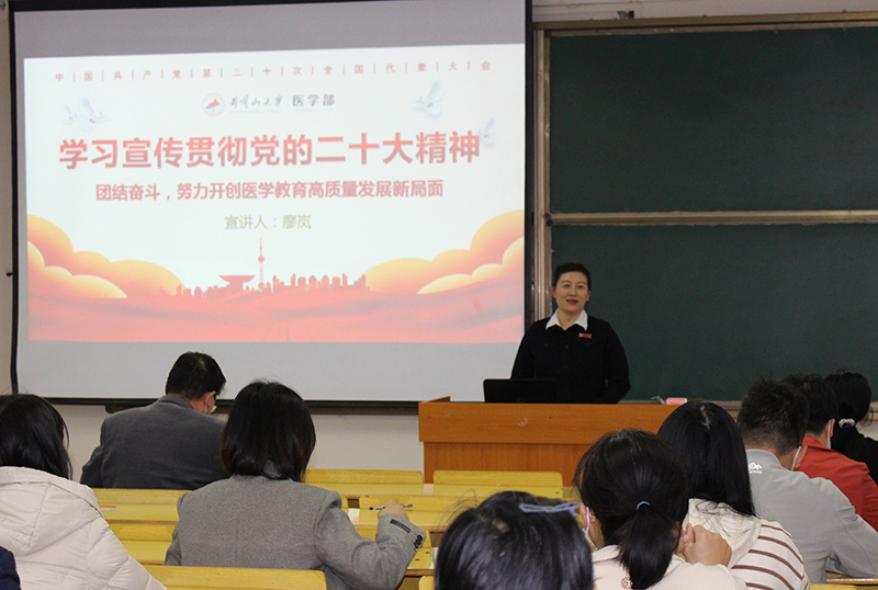 为深入学习宣传贯彻党的二十大精神,让医学部全体教职工的思想和行动与党的二十大精神相统一。11月23日,井冈山大学党委常委副校长廖岚在井冈山大学医学部为医学部全体教职工举行了二十大精神宣讲报告会。