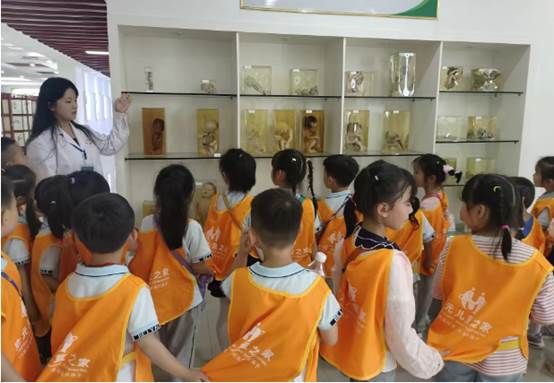 在生命科学馆里,在学生志愿者(23级预防专业李鑫、22级康复专业景郁涵)的引导和讲解下,小探险家们首先参观了“人体胚胎解剖”展厅。这里通过精美的图文展示和各类标本,向小朋友们揭示了生命的起源和演变过程。小朋友们听得津津有味,不时发出惊叹和好奇的声音。