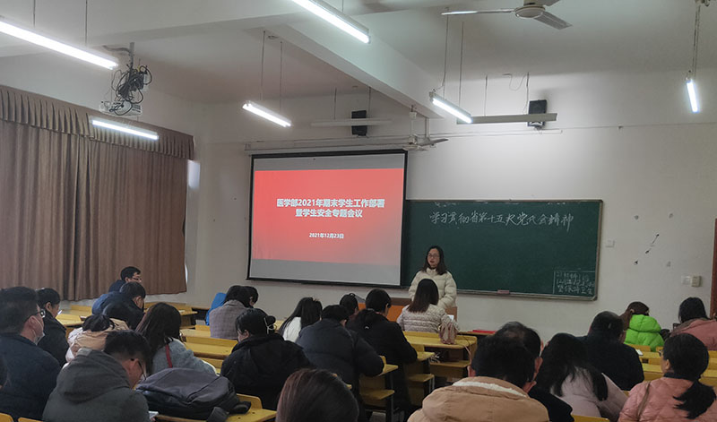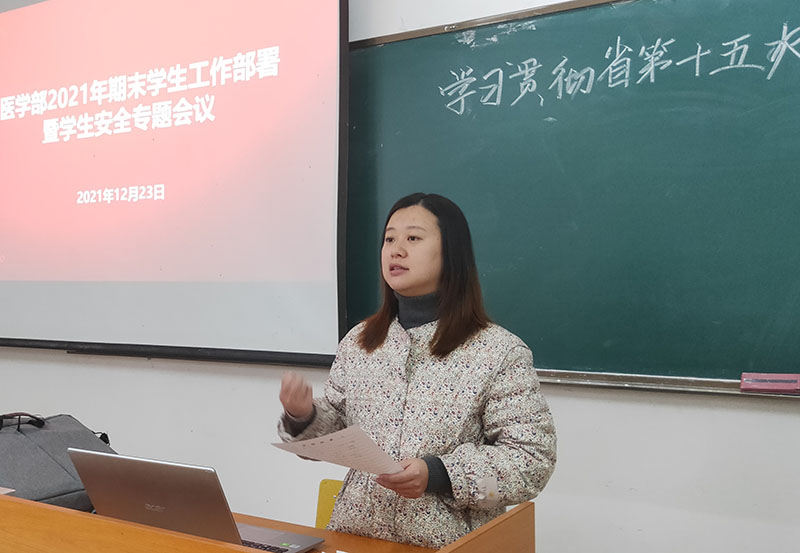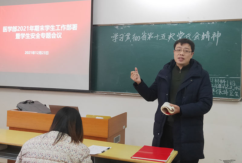 12月23日,医学部2021年期末学生工作部署暨学生安全专题会议在20栋教学楼召开。医学部党委副书记刘坤、周溪出席会议,会议由学生科科长李海栗主持,医学部全体班主任、辅导员参加。