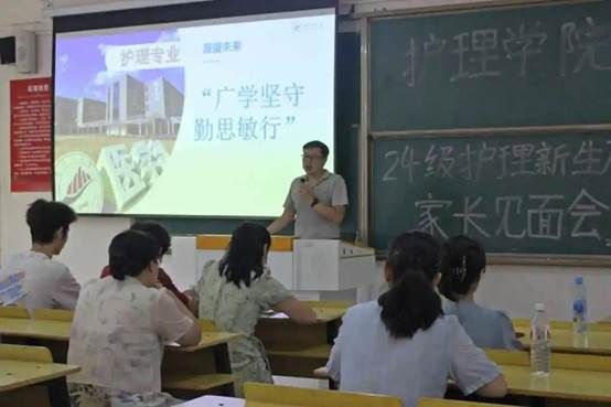 云天收夏色,木叶动秋生。新学期即将开启,井冈山大学护理学院迎来了又一批充满活力与梦想的新生。为帮助新生更快地适应大学生活,加强家校沟通,共同助力孩子的成长与发展,护理学院于9月6日在医学部20栋106召开护理学院2024级新生及家长见面会。此次会议由护理学院党委副书记刘坤主持,护理学院副院长戚燕、护理系主任游睿芳、护理学院学生科科长彭芳参加。