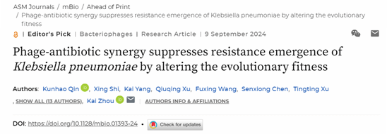 近日,作为井冈山大学与深圳大学、深圳市呼吸疾病研究所的联合研究成果,我部基础医学院秦堃豪博士在噬菌体研究领域研究取得重要进展,以第一作者身份在国际权威学术期刊mBio(影响因子5.1,中国科学院一区TOP)在线发表题为“Phage-antibiotic synergy suppresses resistance emergence of Klebsiella pneumoniae by altering the evolutionary fitness”的研究论文,并被选定为编辑精选(Editor's Pick)文章。