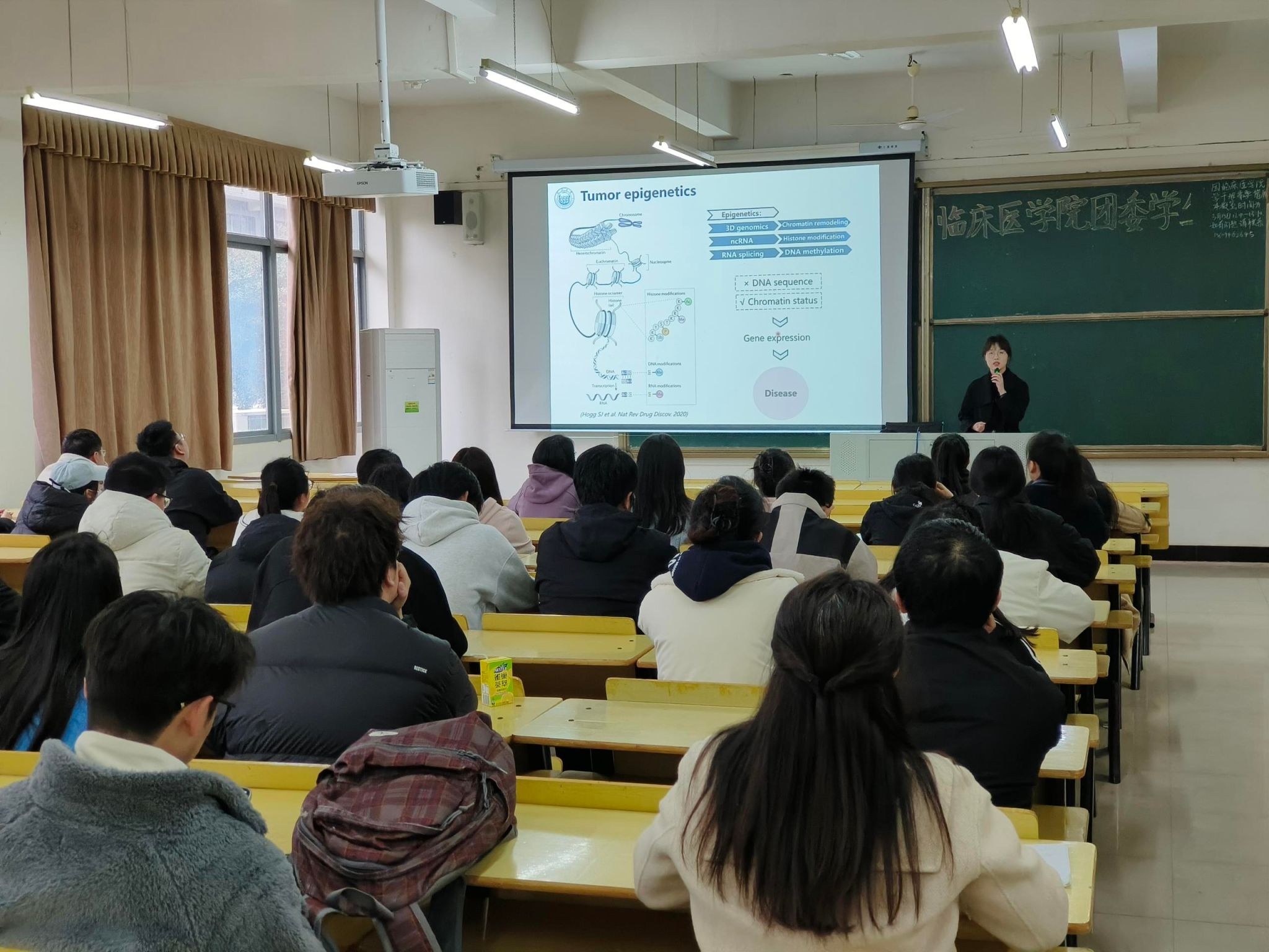 丁天宜老师的报告聚焦长链非编码 RNA(LncRNA)引导染色质重塑对肿瘤发生的关键作用。丁老师详述了LncRNA 有别于其它RNA的独特性质,解析了染色质重塑的分子机制。借助高通量测序技术,直观呈现肿瘤细胞特异性转录调控模式的改变,阐释其扰乱细胞正常功能、助力肿瘤滋生演进的过程,让大家深刻认识到该调控异常的危害。展望未来研究方向时,丁老师点明亟待攻克的难题,如探究 LncRNA 在不同肿瘤微环境下对染色质重塑的动态调控,挖掘上下游通路精细调控 LncRNA 活性的机制,激发科研探索热情。互动环节,师生与丁老师围绕科研论文撰写与投稿等内容深入交流。