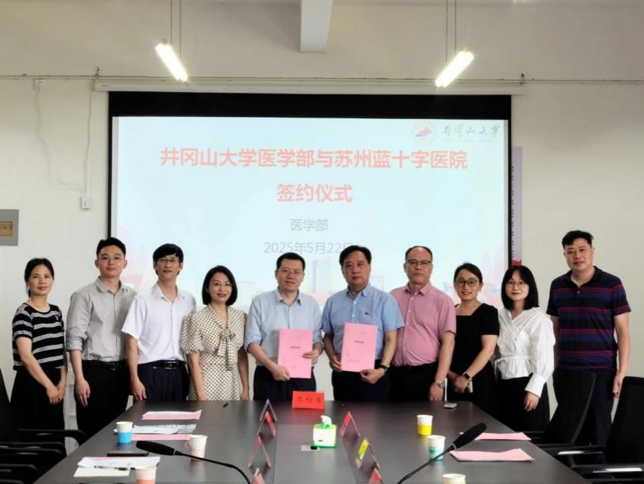 2025年5月22日下午,井冈山大学医学部与苏州蓝十字医院举行产学研合作协议签约仪式。苏州蓝十字脑科医院院长徐必生、副总经理陈彬、人事科长武雪兰、财务科长李丽琼、苏州校友会常务副会长兼秘书长舒健,井冈山大学医学部党工委副书记康永平、井冈山大学招生就业指导处处长欧阳凌、医学部党工委委员万建新、刘坤等见证了签约仪式并进行了座谈交流。