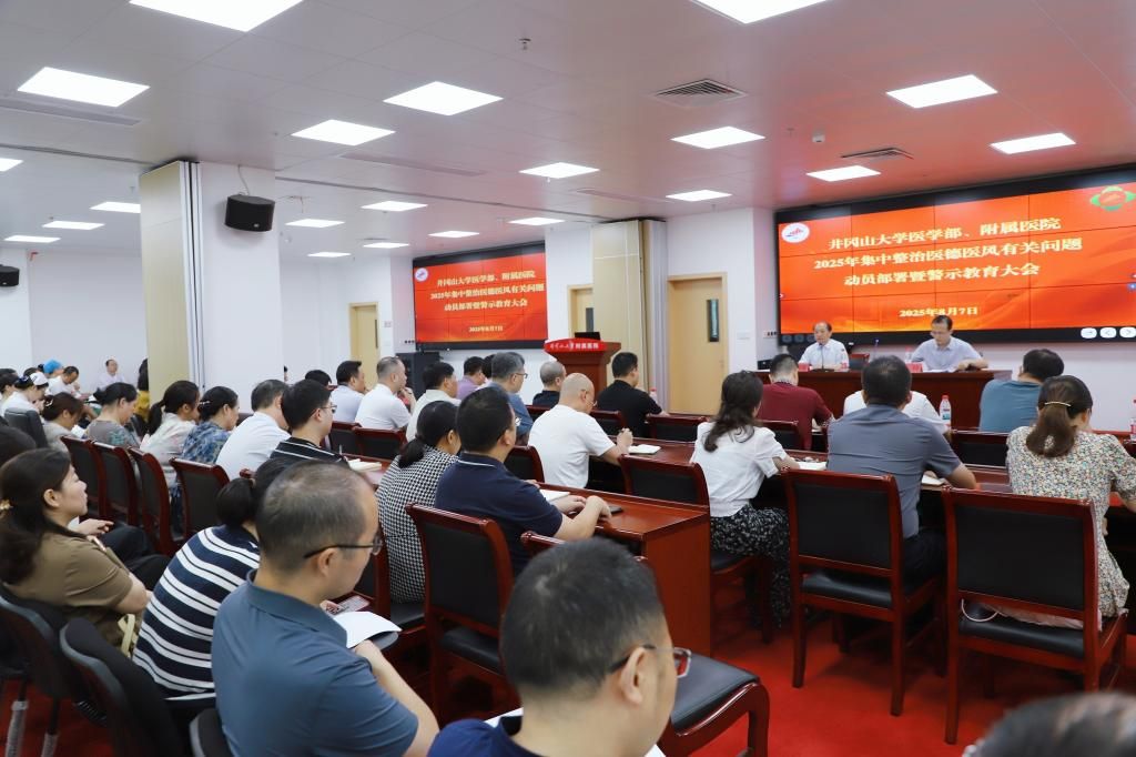 为深入贯彻落实中央、省委、省政府和市委、市政府以及学校党委关于医德医风有关问题集中整治工作的决策部署,2025年8月7日,井冈山大学医学部、附属医院召开2025年集中整治医德医风有关问题动员部署暨警示教育会。医学部党工委委员、附属医院党委书记肖游章作动员讲话,附属医院党委委员、副院长黄玲主持会议。医学部党工委班子成员、干部职工,附属医院党委班子成员、党(总)支部书记、中层干部、各科室医德医风专职人员约200人参加会议。
