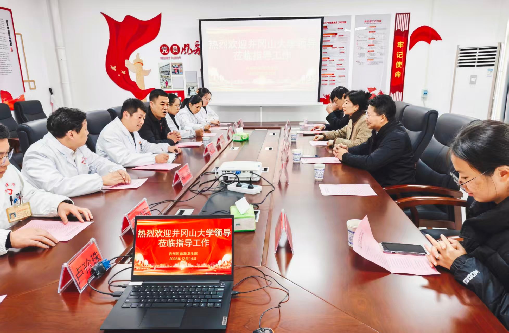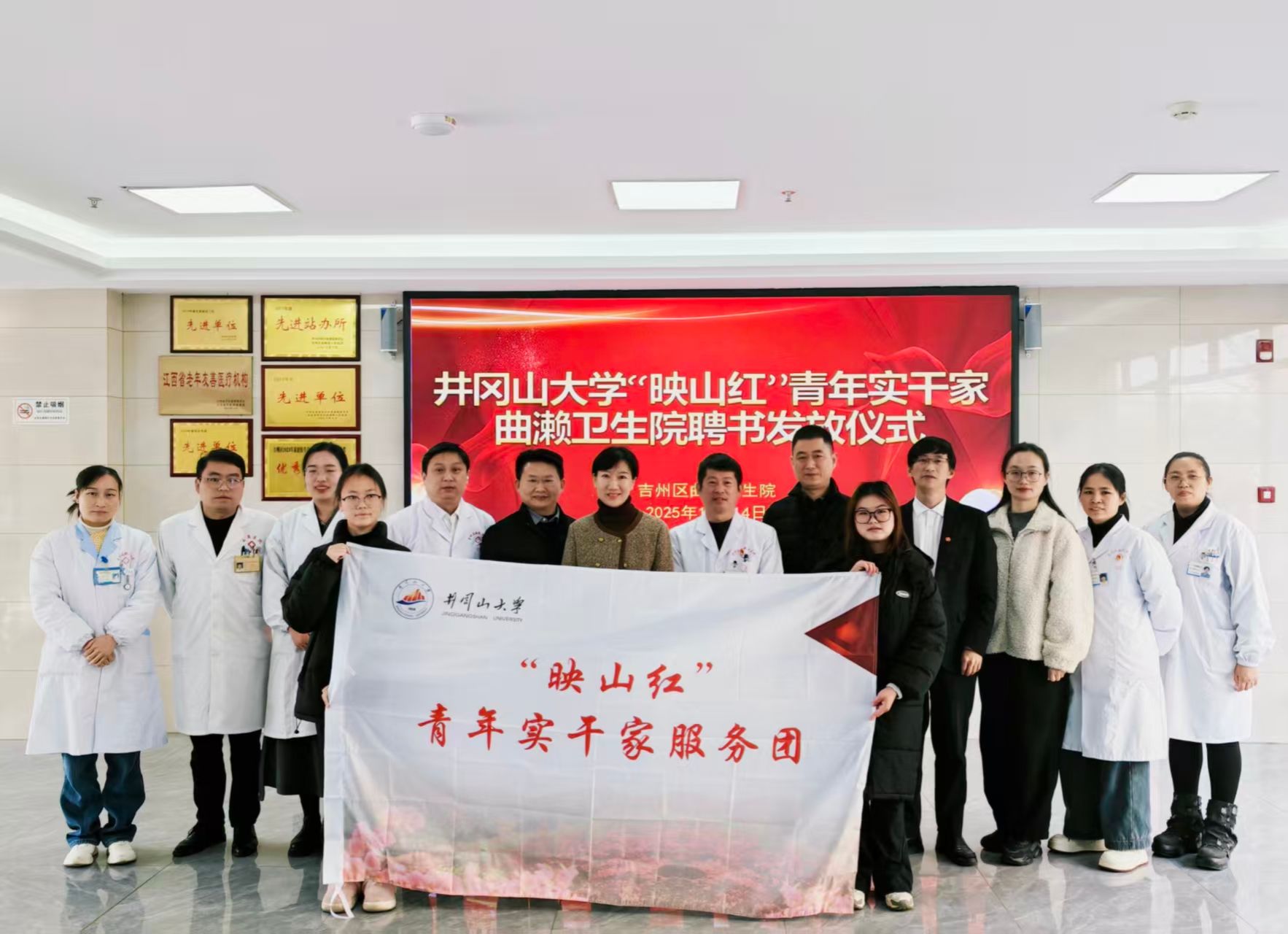 为进一步深化学校“映山红”青年实干家计划,促进校地合作,推动青年人才服务基层医疗卫生事业,12月14日上午,学校与吉州区卫生健康委员会在曲濑镇卫生院联合举行井冈山大学“映山红”青年实干家聘书颁发仪式。校团委书记郭敏娜,医学部副主任尹汉明、基础医学院副书记万建新,吉州区卫健委副主任周佳福,曲濑镇卫生院全体班子成员,2名“映山红”青年实干家学生等参加了仪式。