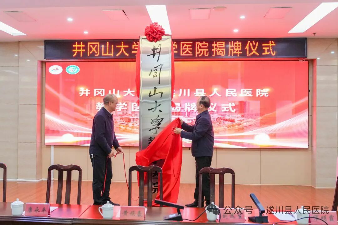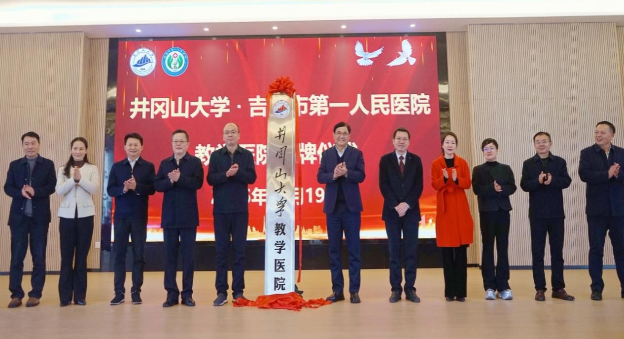 黄族豪副校长介绍了井冈山大学近年发展成效。他表示,学校将与吉安市第一人民医院深化医教协同,创新人才培养模式;开展校院师资互聘,创建高水平教学团队,共育医学人才;拓展合作范围,深化科研医疗合作,实现资源共享、优势互补。最后,黄族豪副校长与张学伟部长共同为“井冈山大学教学医院”揭牌。