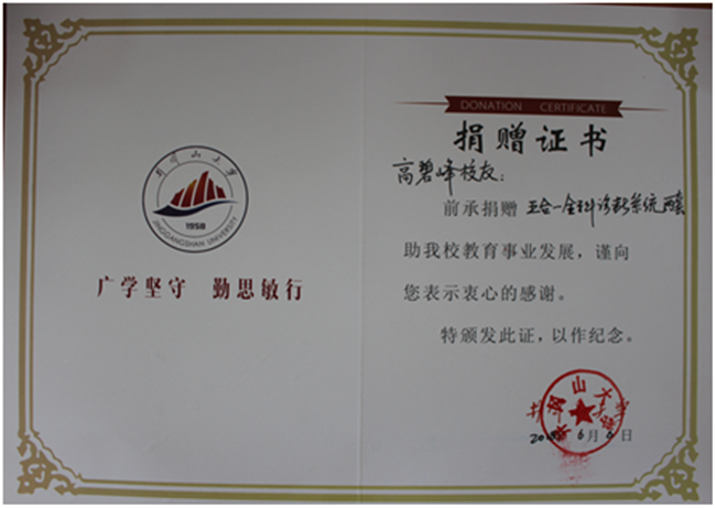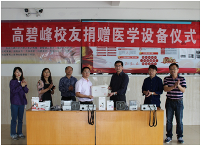 高碧峰校友是农工党党员,2004年毕业于井冈山大学生物医学工程技术专业。毕业后,先后在深圳迈瑞生物医疗电子股份有限公司、江苏鱼跃医疗设备股份有限公司担任销售经理,2013年创办了江西德高医疗科技有限公司,公司主要销售各种高端医疗设备。此次捐赠鱼跃医疗全科医生诊断系统2套(总价值5万元)用于医学部全科医生教学和实训使用,目前已安装完毕。