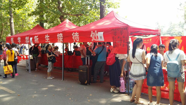 新生们在志愿者的引导下,陆续来到报到处,办理相关手续,遇到人多时,迎新工作人员一人需要接待十多二十新生,整个迎新现场格外火爆,但是报到工作依旧进行的有条不紊。团委学生会干部和志愿者们耐心地为新生和新生家长解答疑惑,帮助新生搬运行李,沿途介绍校园风光,带领他们办理校园一卡通以及寝室入住手续等,忙得不亦乐乎。