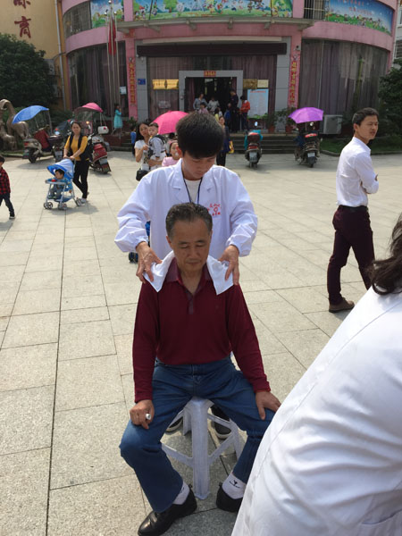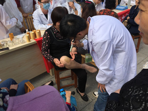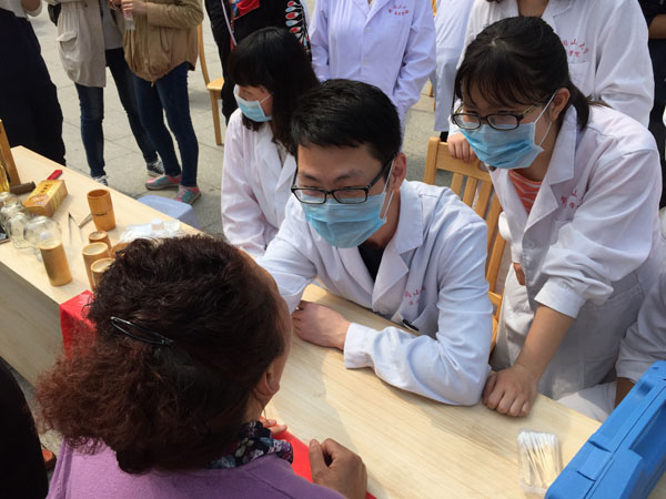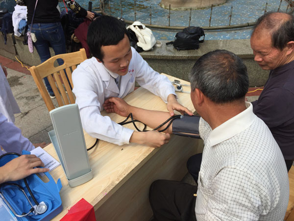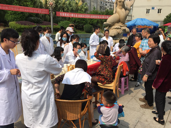 活动中,前来义诊的居民络绎不绝。临床专业同学用血压仪为社区居民测量血压,并为他们解答了关于高血压的一些疑问及讲解了应注意的事项与治疗方法。对高血压患者,为其提供了细致的健康指导。口腔专业同学们进行了口腔检查及日常预防保健知识讲解。十点左右天气日渐炎热,前来咨询的小区群众仍逐渐增多,义诊小组成员们热情不减反增。由中医爱好者协会的按摩、刮痧、拔罐、艾灸活动深得居民欢迎,给劳累的社区居民和腰酸背痛的老年患者送去了福音。