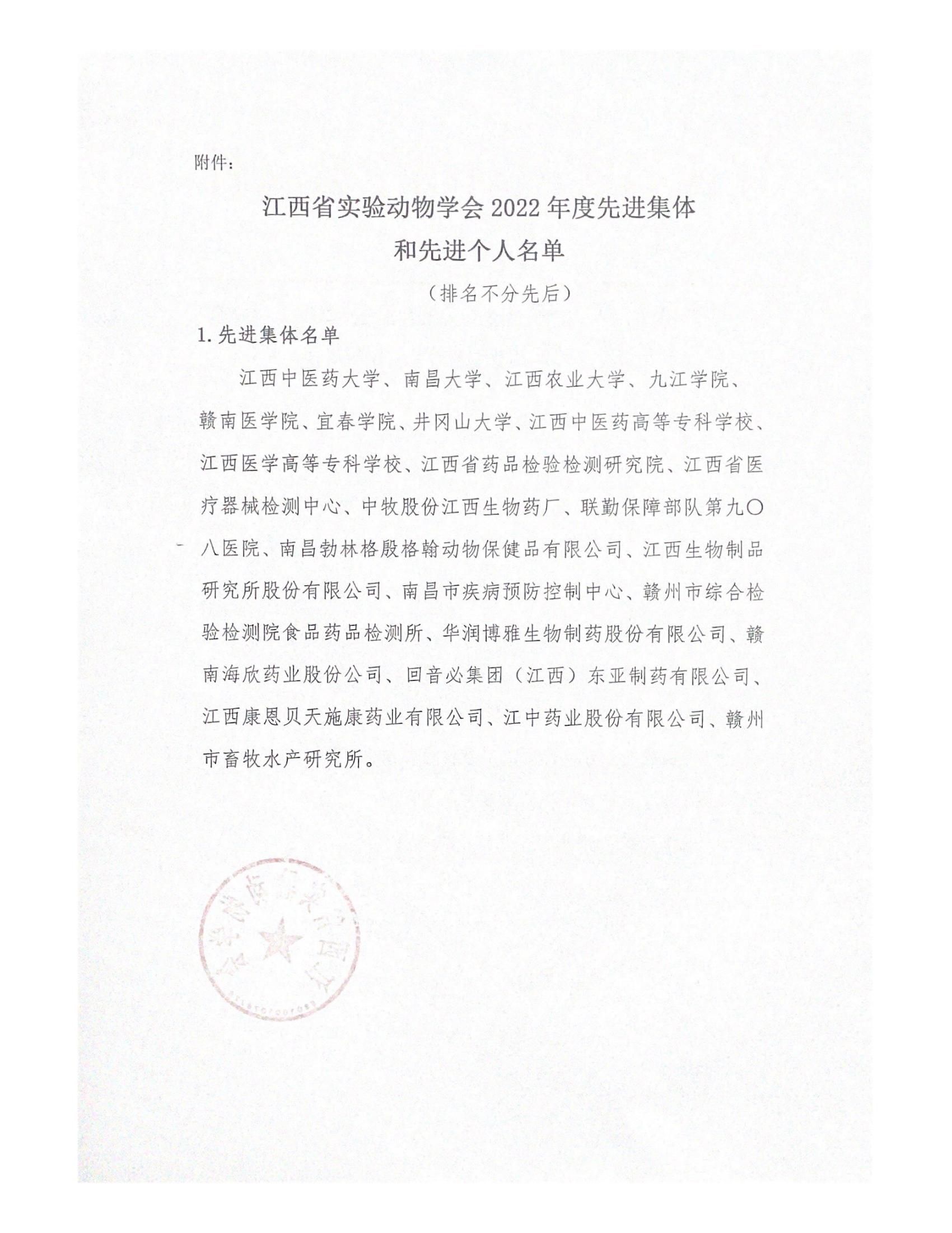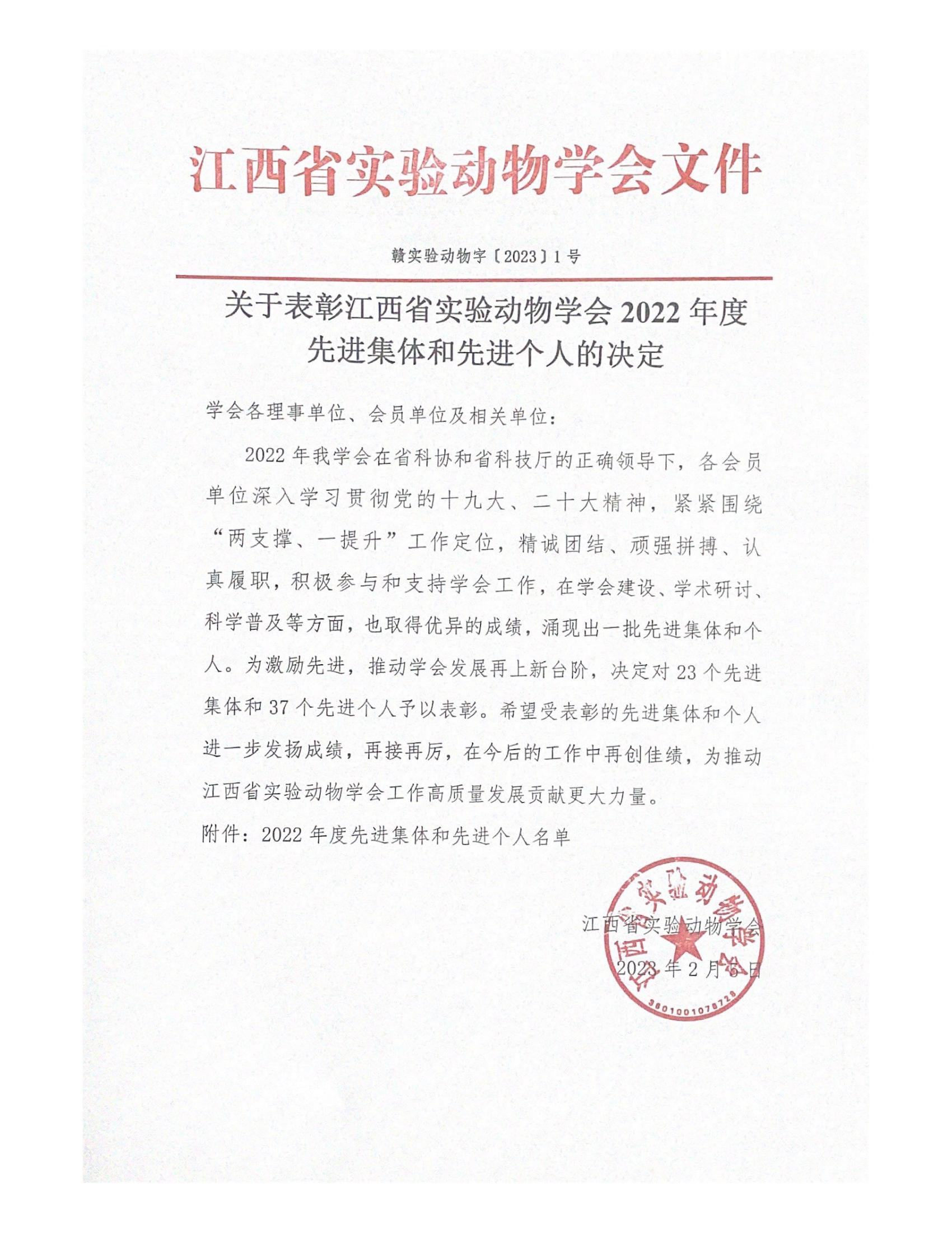 最近获悉,根据《关于表彰江西省实验动物学会2022年度先进集体和先进个人的决定》(赣实验动物字〔2023〕1号)文件,我校获江西省实验动物学会先进集体,胡煜辉同志获得江西省实验动物学会先进个人称号。