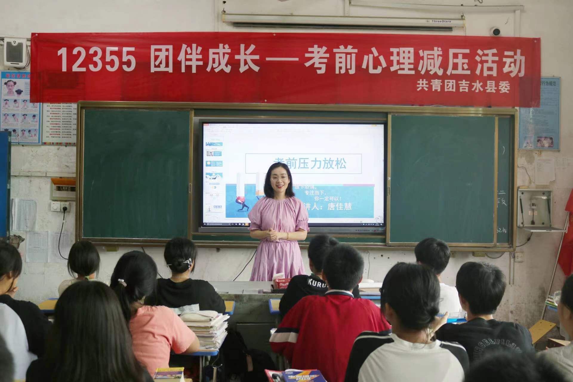 中考来临之际,为帮助初三学子缓解心理压力和焦躁情绪,树立良好的心态,让学子们更好地冲刺中考,6月9日下午,受共青团吉安市委的邀请,井冈山大学医学部心理导师唐佳慧带着学校“医心”心理工作室志愿者为吉水县第四中学初三年级10个班的同学们开展了考前心理减压活动。