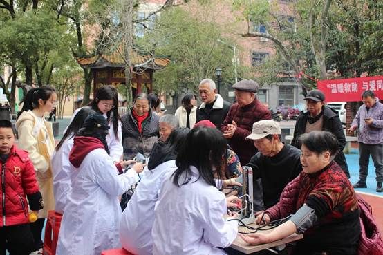 同学们朝气蓬勃,披上白大褂,热情地邀请居民检查身体健康状况,提供量血压、测血糖、按摩、艾灸等服务,耐心地解答居民咨询的健康问题,提供专业的就医建议,并对一些常见疾病的预防及治疗进行介绍。