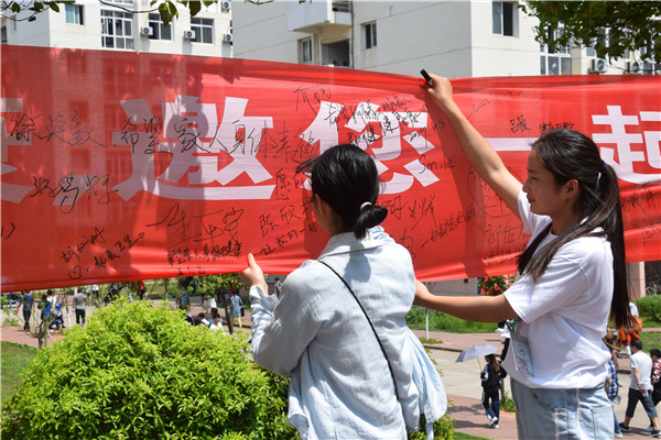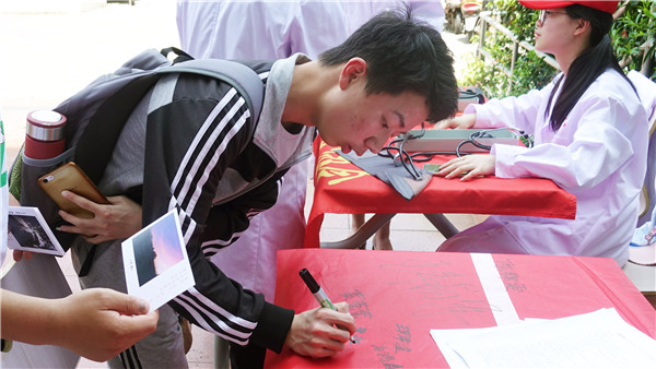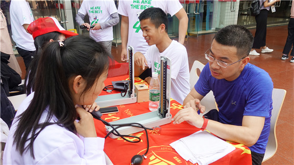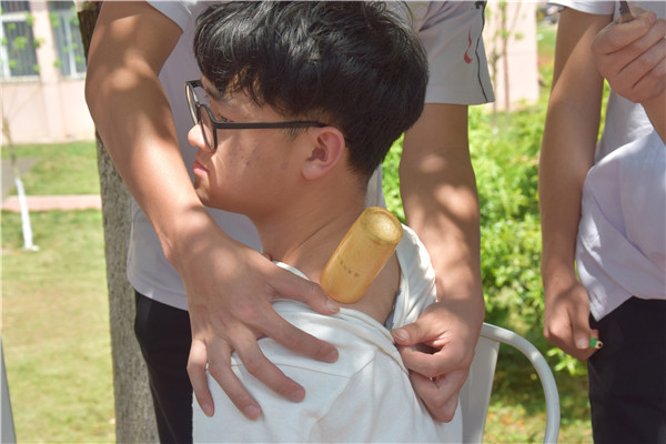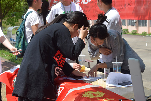 正午时分烈日高照,志愿者们早早来到三个学生食堂门口,摆座椅,拉横幅,准备宣传材料,很快准备工作就绪。刚下课赶来食堂吃饭的师生,被工作人员的宣传热情感染,陆陆续续加入到本次活动中,积极参与健康知识竞答,认真地听取日常健康卫生知识的讲解,踊跃地在活动横幅上签上对改善世界卫生状况的愿望和自己的姓名。中医药爱好者协会的志愿者们,还发挥他们的专长,为师生免费量血压、按摩和拔火罐,活动现场井然有序,热闹非凡。