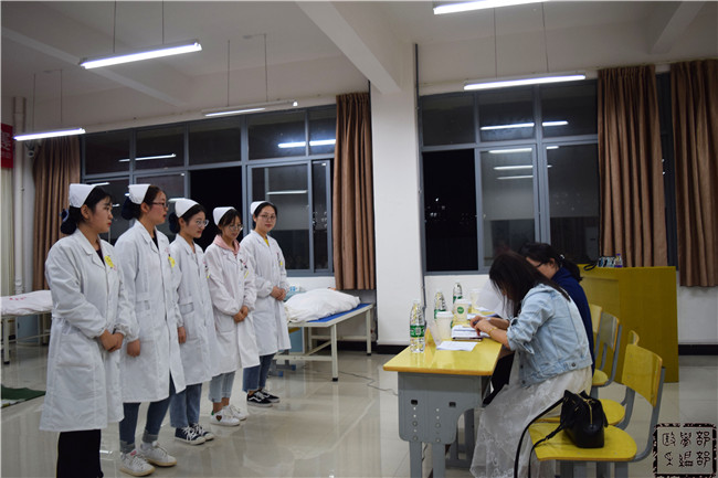 观众与参赛成员早早入场就坐准备,嘉宾老师们准时莅临比赛现场。晚6点30分,比赛正式开始。参赛成员共分为六组。参赛小组各派代表进行抽签以决定出场顺序,接着便是代表抽取一份临床案例,进行思考分析,并针对主要护理问题提出护理措施。同时计时人员从各小组抽取案例时开始进行计时,每组比赛时间限制20分钟。比赛设置健康评估室、抢救室两个考评点。在健康评估中,选手根据所选案例对患者进行评估。在抢救操作中,选手合作完成多项护理操作。参赛成员们以熟练的动作,规范的操作流程进行护理技能展示,老师们公正严格地进行打分并作出相关评价。最后,比赛圆满结束。现场的同学在各组参赛选手实践操作与嘉宾老师们详细点评中也获益匪浅。