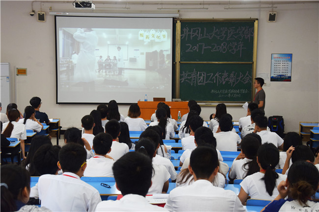 为了表彰在2017-2018学年共青团工作中表现突出的先进集体和个人,同时对一年来的团学工作进行总结,医学部于6月10日上午10点整在11栋B-104教室召开了2017年五四表彰大会暨第三届医药文化节总结大会。医学部团委负责人李海栗老师出席了本次大会,参加本次大会的还有医学部团委学生会干部,16级、17级各班班长以及获奖学生代表。