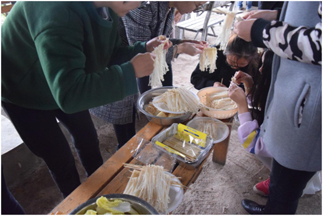 所有成员按规定时间到北区大门集合,并一起乘车到达素拓目的地--绿色农家小院。下车后,所有人员开始分工--搬运东西、洗菜、串串子。大风带来的降温并没有束缚大家的活动,大家都很期待成果展现的时候。“众人拾柴火焰高”,烧烤材料都已经准备好了,烧烤台的炭火早就燃起了所有人的热情,大家很快分配完了食物。接着,烧烤开始了,大家围着烧烤台,边等着食物变熟边谈笑风生。坐在露天烧烤台边,冷风并没有带走每个人脸上洋溢着的笑容。风中飘散着食物的香味,也凝聚着大家的情感。烧烤结束后,所有人放下碗筷,走向了橘子园,开始了活动的第三部分--摘橘子。部长们不顾天冷直接上手摘桔子,弄得满手黄色橘子皮汁。摘桔子过程中,大家分工合作--摘橘子、剥桔子、分享橘子……