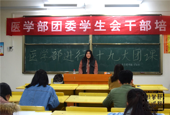 为了更好地贯彻落实十九大精神,让当代青年大学生深刻理解十九大精神的意义所在,2018年3月14日晚18:30医学部团委学生会于109教室召开了学习十九大精神系列团课。本次党课由医学部团委学生副书记程莹主讲,医学部第二期学干班所有成员参与听讲。