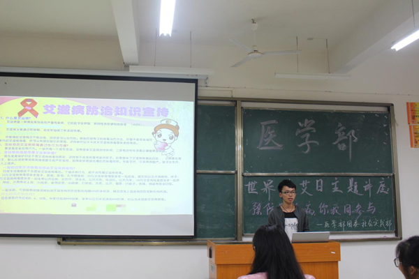 讲座,临床、中医、口腔、预防、康复专业共约100人听取了讲座。社会实践部助理邹柏松向大家介绍了艾滋病的含义——“什么是艾滋病”、“艾滋病不同病期的症状”、艾滋病的危害性、传播途径以及预防艾滋病的技巧,展示了许多关于艾滋病11月26日晚,在13栋C区109教室举办了“预防艾滋”专题病例的照片,呼吁大家积极参与“防艾”。现场还设置了问答环节,就“关艾”、“防艾”相关知识进行问答,现场同学积极参与,气氛轻松活跃。