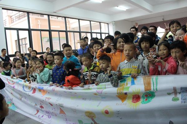 刚进入学校时,教室显得非常安静,几个学生用熟络的手语彼此交流着。志愿者们把孩子们带到大厅,准备好游戏道具(篮球、矿泉水瓶),快速融入了孩子们的群体,以朋友的角色和孩子们开展了三个简单又不失乐趣的游戏“篮球保龄”“画画”“跳绳”。起初,孩子们因为害羞不敢主动与志愿者们交流,在经过各种有趣的互动游戏后,他们终于敞开心扉融入集体,也许他们由于身体先天性的缺陷,无法用笑声表达来自己内心的喜悦,但是他们脸上天真灿烂的笑容深深感动了每一位志愿者。最后,志愿者们给孩子们赠予了小礼物,并互留了联系方式。